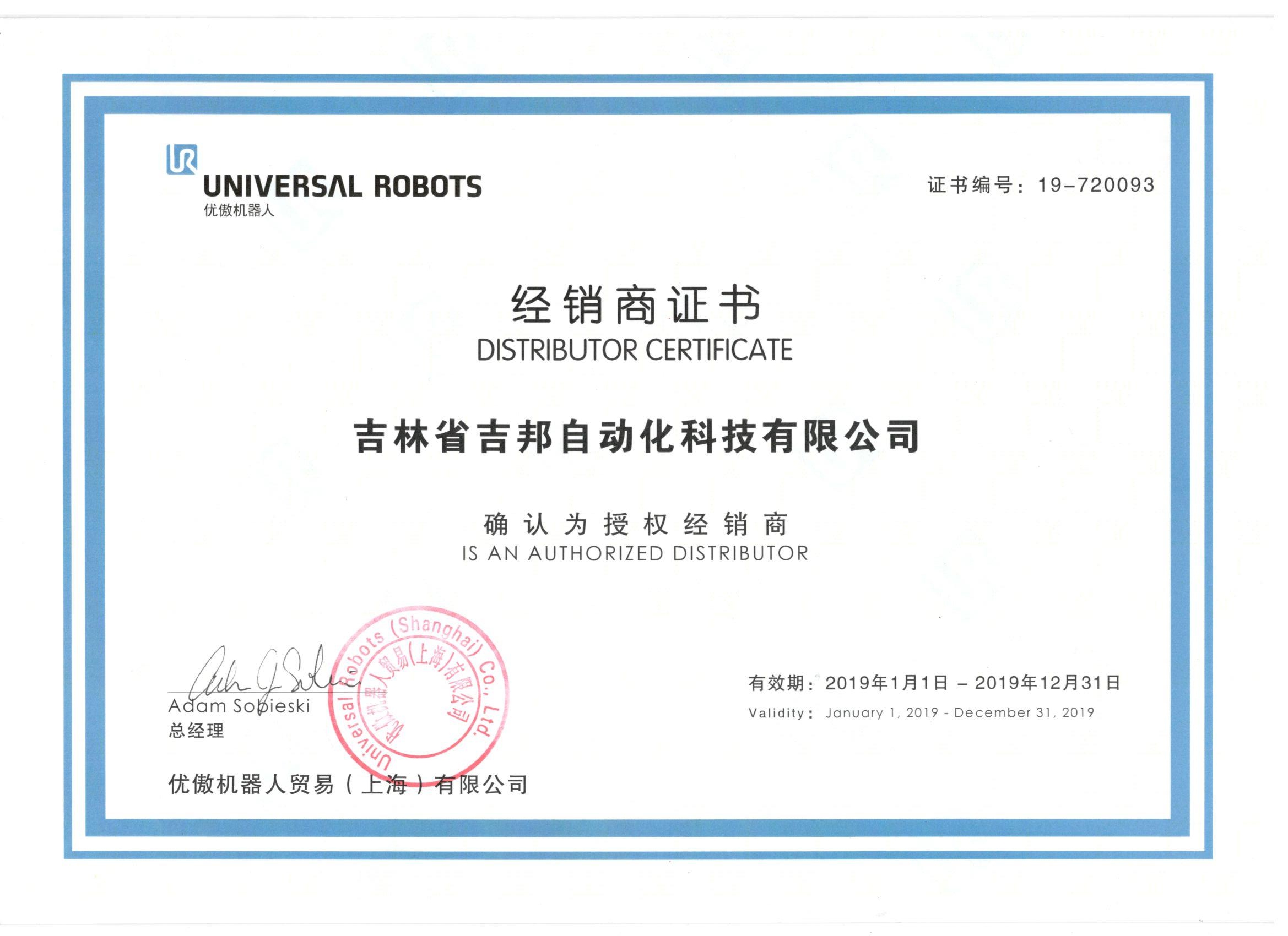 UR機(jī)器人經(jīng)銷商證書